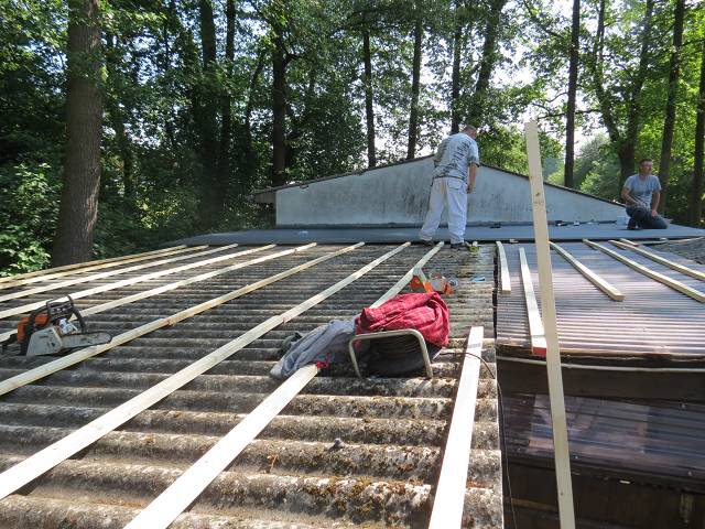 Die Arbeiten zur Erneuerung des Maschendrahtzaunes (Seebadseite) konnten vollendet werden. Die Dächer und Regenrinnen wurden gesäubert. Vorbereitende Arbeiten für unseren 3. Arbeitseinsatz wurden durchgeführt. So wurden die Halterungen für die geplante Erweiterung der Überdachungen im Schuppenbereich einbetoniert und die Außenfassade im Bereich Mietwohnung und Toiletten für den bevorstehenden Anstrich grundiert. Schwerpunkt des Arbeitseinsatzes und auch der kostenintensivste Part war die Erneuerung des Daches der Werkstatt und des Geräteschuppens. Das Dach erhielt neue beschichtete Profilbleche. In diesem Bereich sind damit die Sorgen wegen bestehender Undichtigkeiten beseitigt worden. Also wie Anfangs erwähnt es wurde viel geschafft und es hat wieder Spaß gemacht.